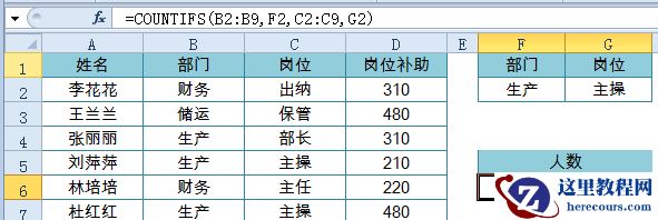 5、多条件计数要求:统计统计部门为生产,并且岗位为主操的人数公式:=COUNTIFS(B2:B9,F2,C2:C9,G2)