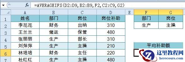 6、多条件计算平均值要求:统计统计部门为生产,并且岗位为主操的平均补助额公式:=AVERAGEIFS(D2:D9,B2:B9,F2,C2:C9,G2)