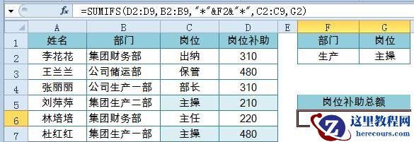 4、包含关键字的多条件求和要求:统计部门包含“生产”,并且岗位为主操的补助总额公式:=SUMIFS(D2:D9,B2:B9,”*”&F2&”*”,C2:C9,G2)