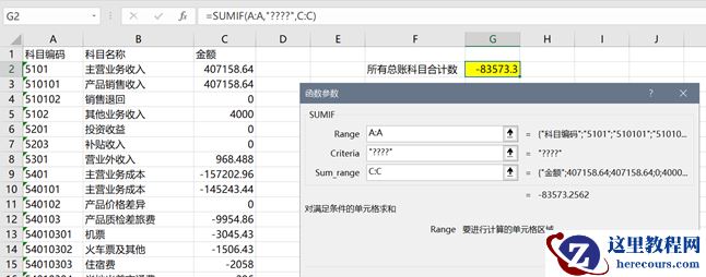 下图是一个示例,A列是科目编码,其中4位编码是总账科目,按照收入为正、支出为负的格式输入金额,这些总账科目数据加起来,就是净利润,此时可以使用问号来匹配4位编码进行求和,公式如下: