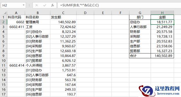 下图就是这样的一种情况。左侧A:C列是从K3导出的管理费用余额表数据,右侧是按照部门汇总的结果,单元格H2公式如下: