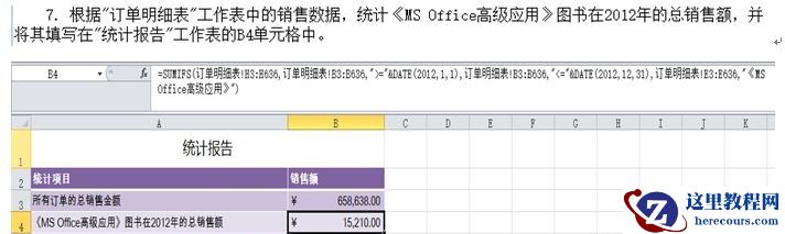 首先第一个参数sum_range我们要输入求和的范围,也就是”订单明细表”工作表中的小计列,范围是H3:H636;接下来输入第二个参数range,也就是条件区域,选择”订单明细表”工作表中的日期列B3:B636,第三个参数criteria输入条件,”>=”&DATE(2012,1,1);接下来输入第四个参数range2,也就是条件区域,选择”订单明细表”工作表中的日期列B3:B636,第五个参数criteria2输入条件,”<=”&DATE(2012,12,31);接下来输入第六个参数range3,也就是条件区域,选择”订单明细表”工作表中的图书名称列E3:E636,第七个参数criteria3输入条件,《MS Office高级应用》。最后点击确定即可。