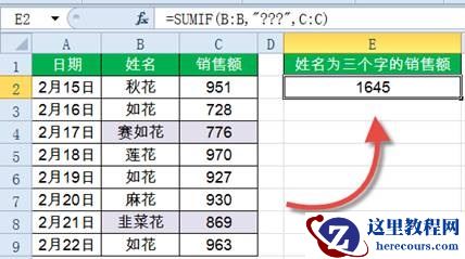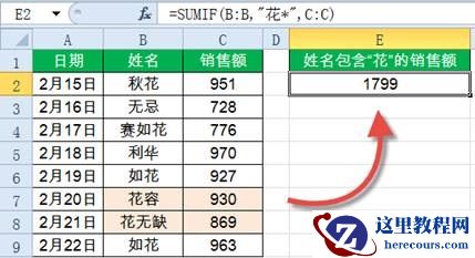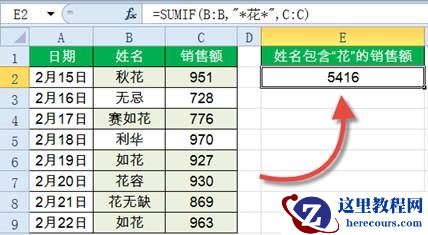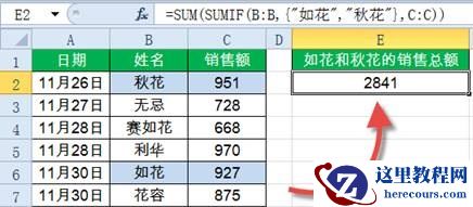 =SUM(SUMIF(B:B,{“如花”,”秋花”},C:C))