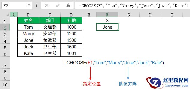 =CHOOSE(F1,”Tom”,”Marry”,”Jone”,”Jack”,”Kate”)