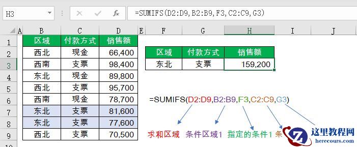 =SUMIFS(求和区域,条件区域1,指定条件1,条件区域2,指定条件2)