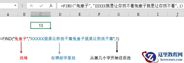 =FIND(找啥,在哪段字里找,从第几个字开始往后找)