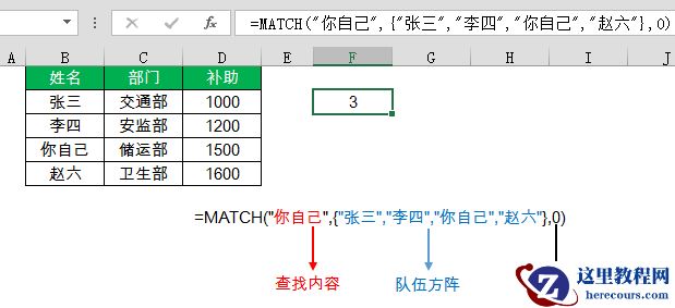 =MATCH(“你自己”,{“张三”,”李四”,”你自己”,”赵六”},0)