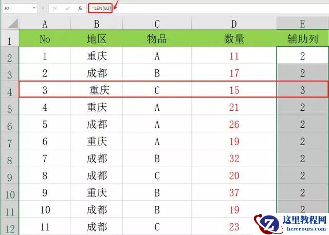 メ回到原表,在E2输入函数:=LEN(B2)并下拉复制。发现只有E4:=3,这表明B列中B4文本出现格式错误。メ