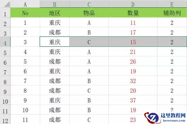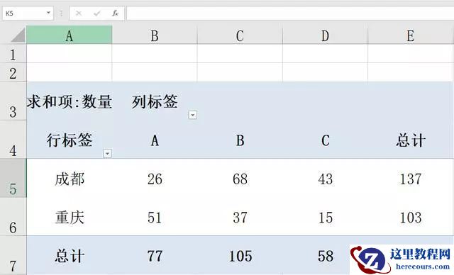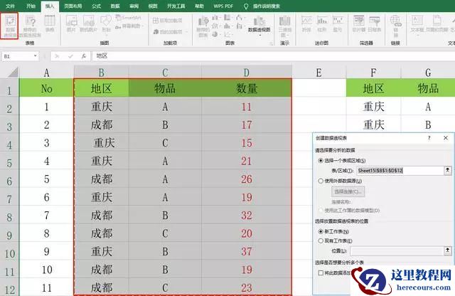 メ设置【行:地区】【列:物品】【值:数量】,然而我们发现数据透视表出现了两行【重庆】。メ
