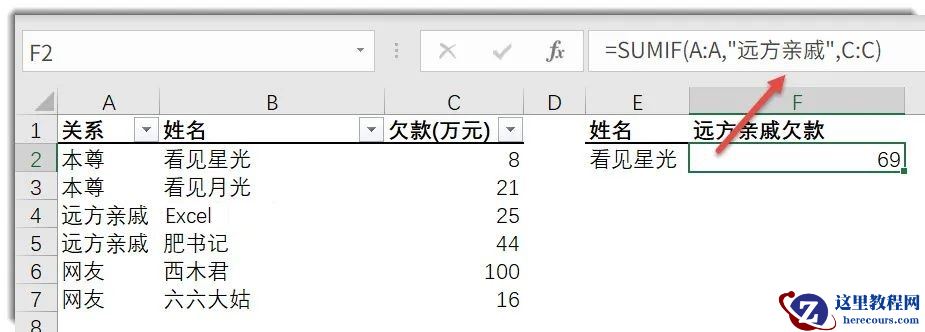 =SUMIF(A:A,”远方亲戚”,C:C)