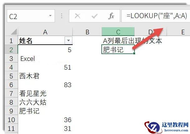 返回A列最后出现的文本▼