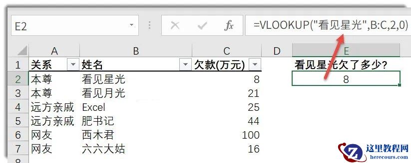 =VLOOKUP(“看见星光”,B:C,2,0)