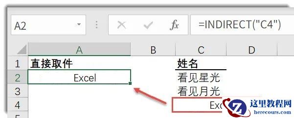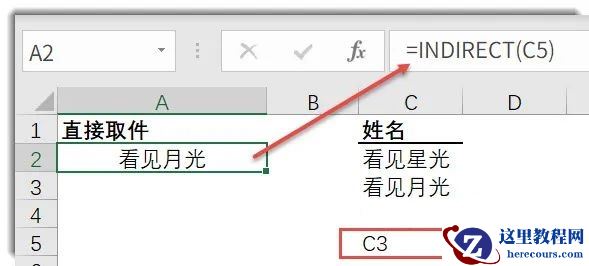 INDIRECT先去C5找地址,C5单元格的内容是C3,于是INDIRECT就再去C3单元格取件,返回C3单元格的值看见月光。不过需要说明的是邮递小哥只提供一次这样的服务。