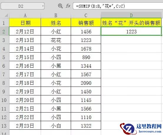 =SUMIF(B:B,”花*”,C:C)