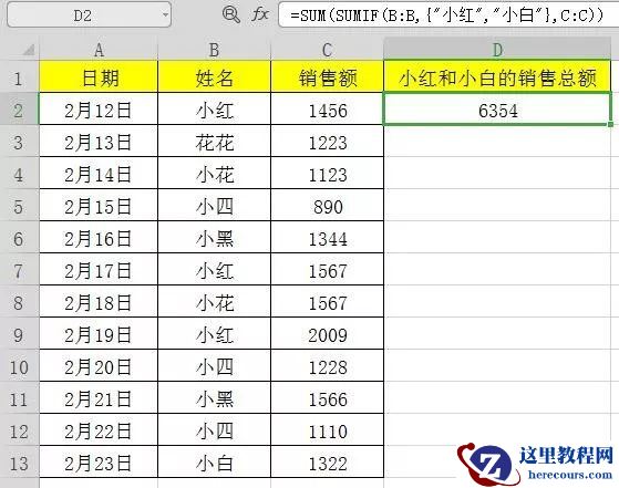 =SUM(SUMIF(B:B,{“如花”,”秋花”},C:C))