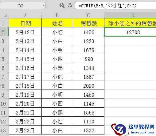 =SUMIF(B:B,”<>小红”,C:C)
