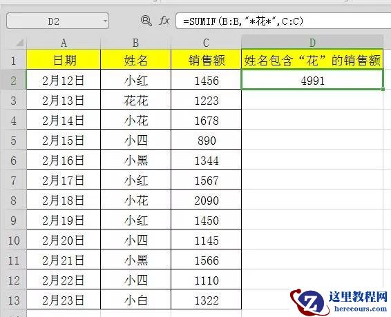 =SUMIF(B:B,”*花*”,C:C)