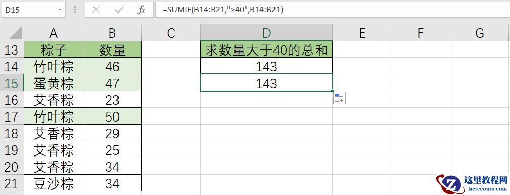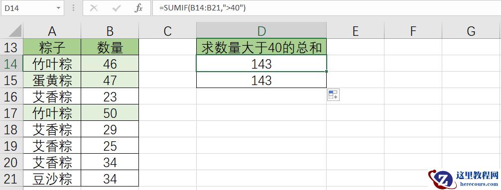 此时由于第1参数和第3参数相同,也就是条件区域和求和区域相同,第3参数可以省略,公式可以简写为=SUMIF(B14:B21,”>40″)。