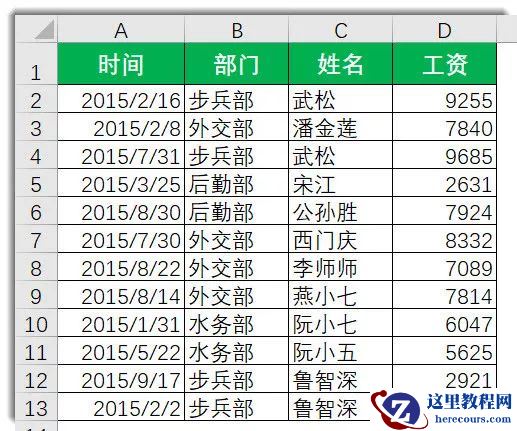 假设下面这张图,是某个公司工资发放的部分记录表(数据纯属虚拟,如有雷同,那是穿越)。A列是工资发放的时间,B列是员工所属的部门,C列是员工姓名,D列是相关员工领取的工资金额。