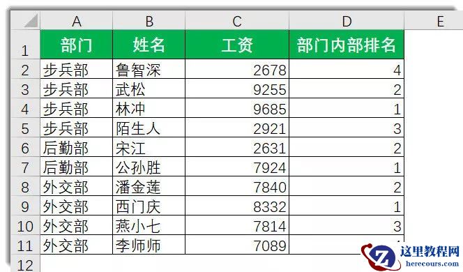 如上图所示,某个月某个公司某些人领了某些工资,然后呢,他们想看看自己的工资,在部门内的排名情况,比如说步兵部的鲁智深都是老员工了,非常想知道自个工资在各自部门排几号。