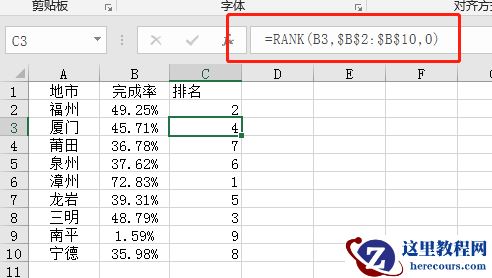 函数公式:=RANK(B3,$B$2:$B$10,0)