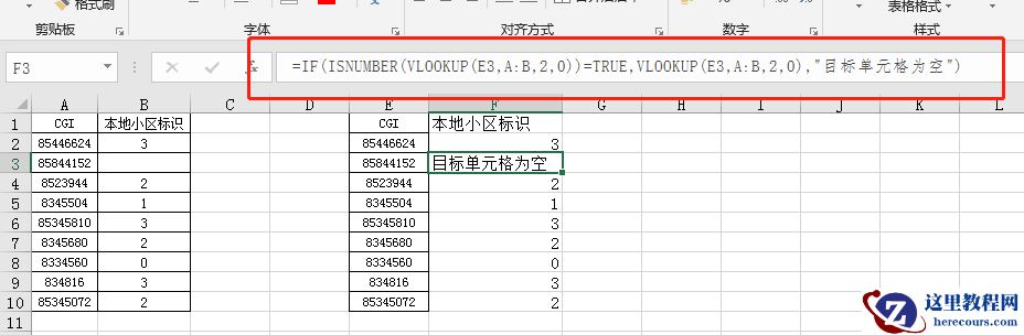 【方法1】函数公式:=IF(ISNUMBER(VLOOKUP(E3,A:B,2,0))=TRUE,VLOOKUP(E3,A:B,2,0),”目标单元格为空”)