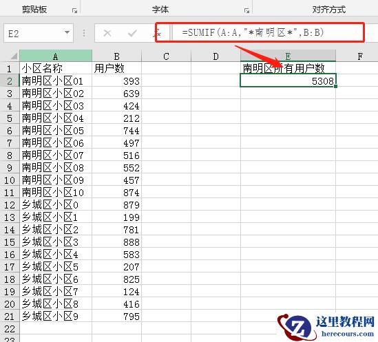 函数公式:=SUMIF(A:A,”*南明区*”,B:B)