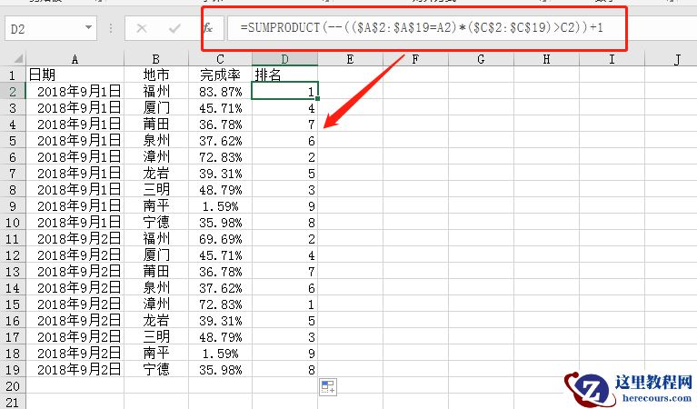 函数公式:=SUMPRODUCT(–(($A$2:$A$19=A2)*($C$2:$C$19)>C2))+1