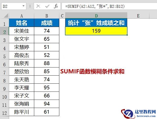 =SUMIF(A2:A12,”张*”,B2:B12)