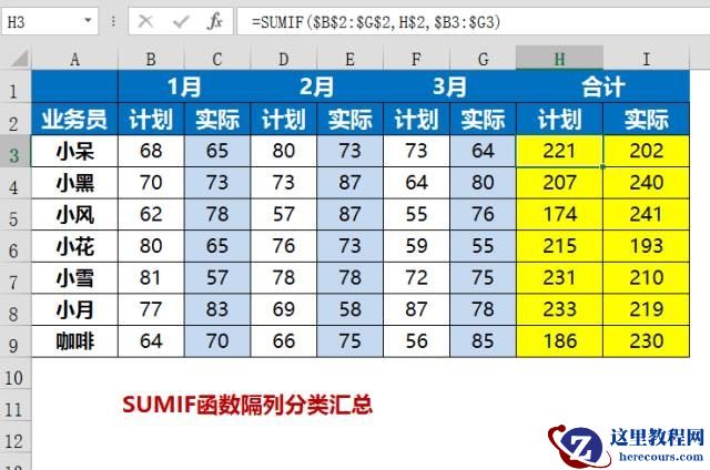 在这里案例中,每个业务员制定的计划数据和实际完成数据交替出现,最后要在黄色区域输入公式,完成对应的计划和实际总和的统计。