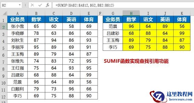 要实现按照业务员查找对应的成绩,一个公式搞定。