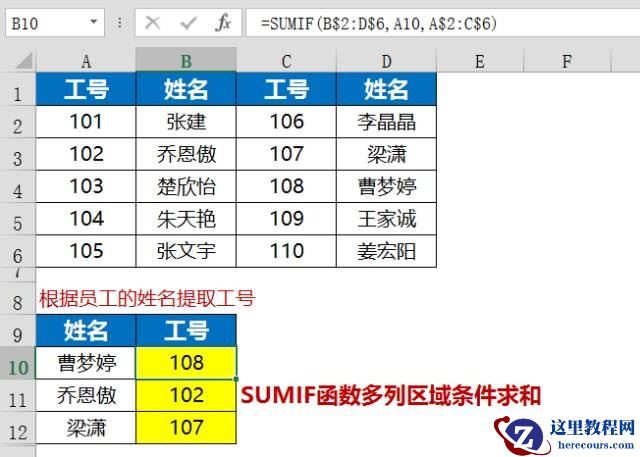 上图展示的是某企业的员工工号信息表,工号和对应姓名放置在多列区域中,需要在B10:B12单元格区域根据员工的姓名提取对应的员工工号。