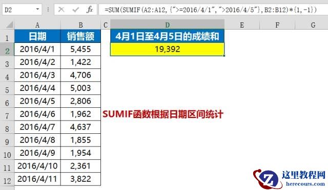 =SUM(SUMIF(A2:A12,{“>=2016/4/1″,”>2016/4/5″},B2:B12)*{1,-1})