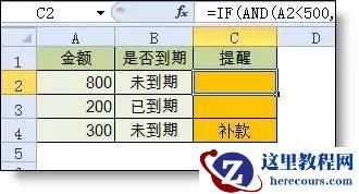 =IF(AND(A2<500,B2=”未到期”),”补款”,””)