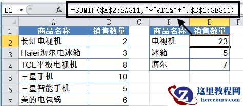 如下图,要根据D列的商品名称关键字,来统计对应的销售数量。