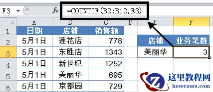 如下图,要统计指定店铺的业务笔数。也就是统计B列中有多少个指定的店铺名称。