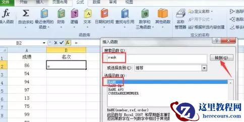 单击一下名次下面的一个单元格,然后点击 公式 选项中的 插入函数 选项,然后弹出来一个对话框,在 搜索函数 中输入 rank ,然后点击转到,默认的就是 RANK 函数,接着点击 确定。
