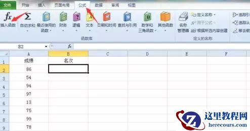 打开excel,第一列输入了一列 成绩,第二列是 名次,下面我们就开始对成绩进行排序了。