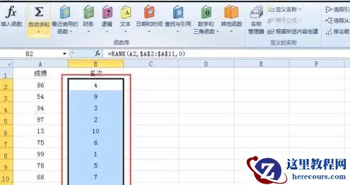 然后将鼠标放在 B2 单元格的右下角按住往下拖动到B11单元格,这样排序就完成了。