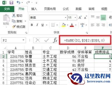输入公式=RANK(D2,$D$2:$D$8,0)。