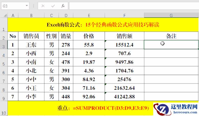 在目标单元格中输入公式:=SUMPRODUCT(D3:D9,E3:E9)。