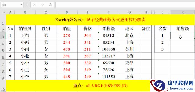 在目标单元格中输入公式:=LARGE(F$3:F$9,J3)。