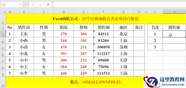 在目标单元格中输入公式:=SMALL(F$3:F$9,J3)。