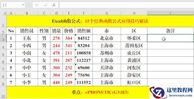 在目标单元格中输入公式:=PHONETIC(G3:H3)。