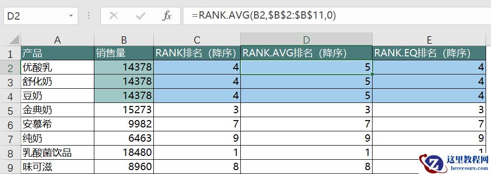 D2=RANK.AVG(B2,$B$2:$B$11,0)