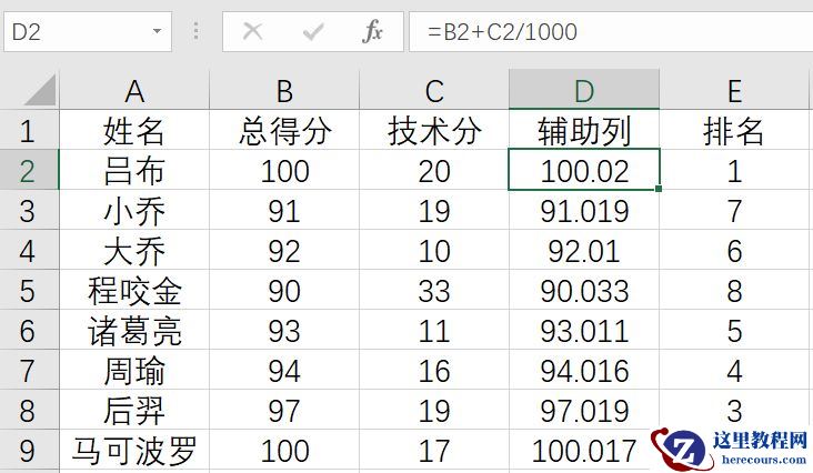 如果直接用B列+C列排名的话,技术分有的加起来就会立马变得很高,所以我们把总得分和技术分的权重为1000:1,甚至可以更大的比例,根据实际数据来进行排名。