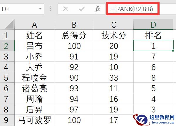 在D2中输入=RANK(B2,B:B),得到了排名的结果