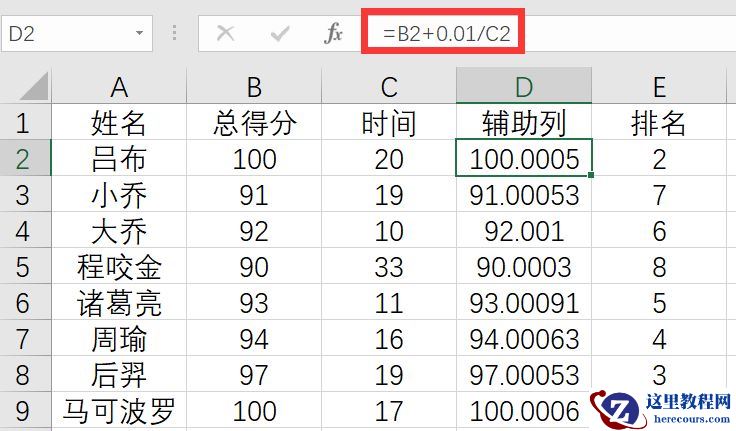 如果现在要求总得分一致的情况下,时间越少,排名越好,那就是说吕布和马可波罗同样100分的情况下,马可波罗17比20少,可以排在前面,这个时候就需要用辅助列D2单元格输入公式=B2+0.01/C2,然后在E列使用公式=RANK(D2,D:D)即可,得到的结果如下所示: