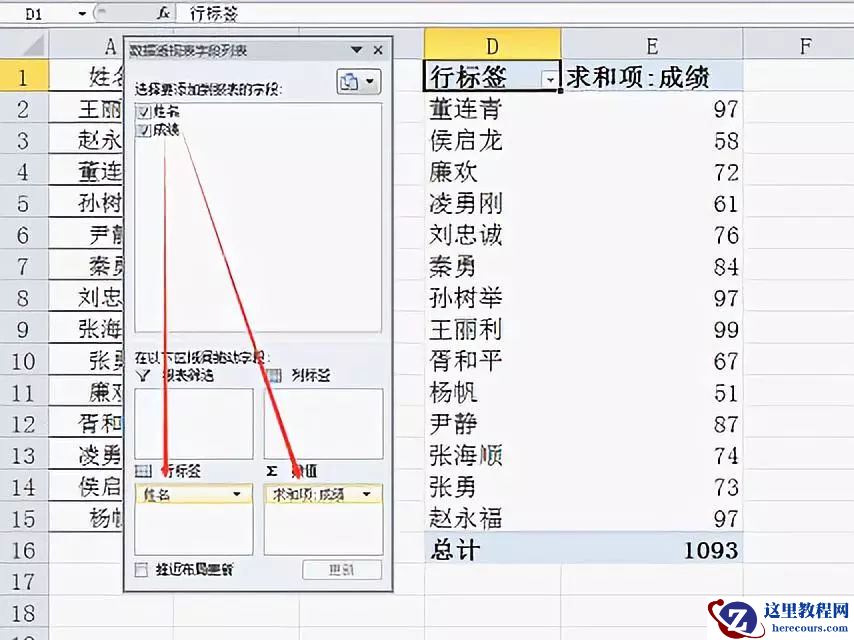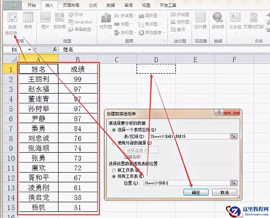 插入数据透视表,将透视结果放置在现有工作表中,点击确定: