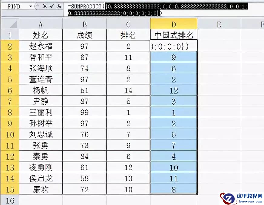 最后由SUMPRODUCT函数进行求和,得到当前成绩的排名,